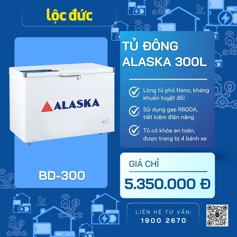 1️⃣ TỦ ĐÔNG ALASKA 300/220 LÍT BD-300 NHÔM (R600A) (RỖ NHỰA)