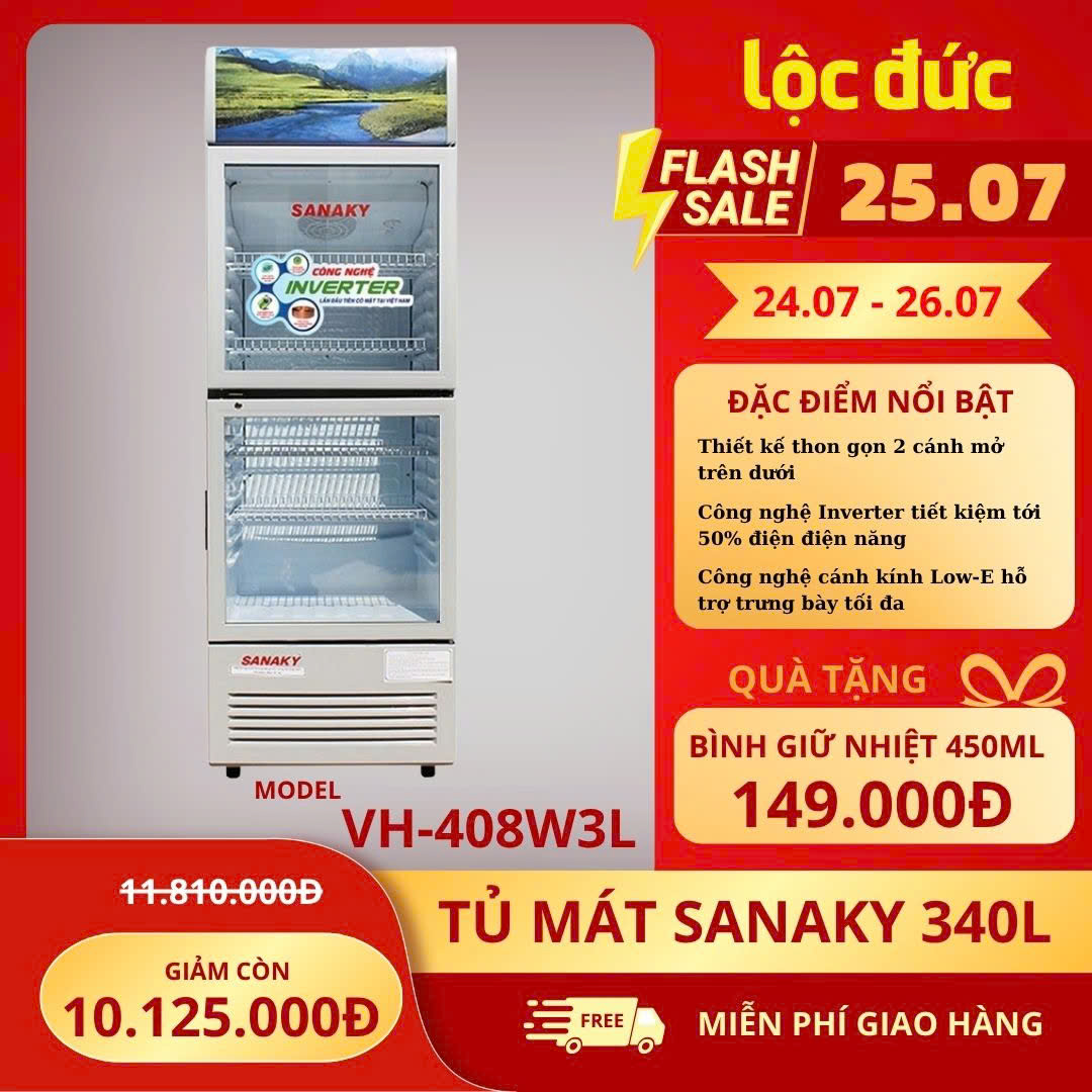 3️⃣ TỦ MÁT 2 CỬA SANAKY INVERTER 340 LÍT VH-408W3L (LOW-E) (R600A)